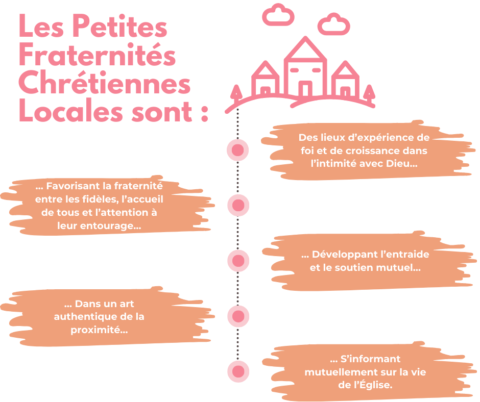 Répondant à la quête de sens de nos contemporains, ces Petites Fraternités Chrétiennes Locales se veulent la traduction concrète du désir exprimé par beaucoup qu’existent des lieux fraternels et ouverts à tous, où puissent se vivre des temps de partage et de prière en commun. Il s’agit de petites équipes accueillantes à toute personne désireuse de découvrir l’Évangile. Elles permettent aussi l’accueil et l’intégration des néophytes ou des personnes qui ne se sentent pas (encore) à l’aise dans les communautés paroissiales.